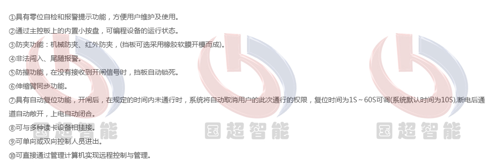 整個(gè)道閘外形采用SUS304不銹鋼板沖壓成型,智能翼閘能方便兼容IC卡、ID卡、條碼卡、指紋等讀卡識(shí)別設(shè)備的使用,為出入人員提供文明、有序的通行方式,有效管理人員進(jìn)出??蓮V泛應(yīng)用于車站、碼頭、地鐵、工廠、大廈、智能小區(qū)、賓館、會(huì)所、企事業(yè)單位等需要對(duì)通道實(shí)現(xiàn)智能化管理的場(chǎng)合。分為:單機(jī)芯:用于單通道和多通道;雙機(jī)芯:用于多通道。